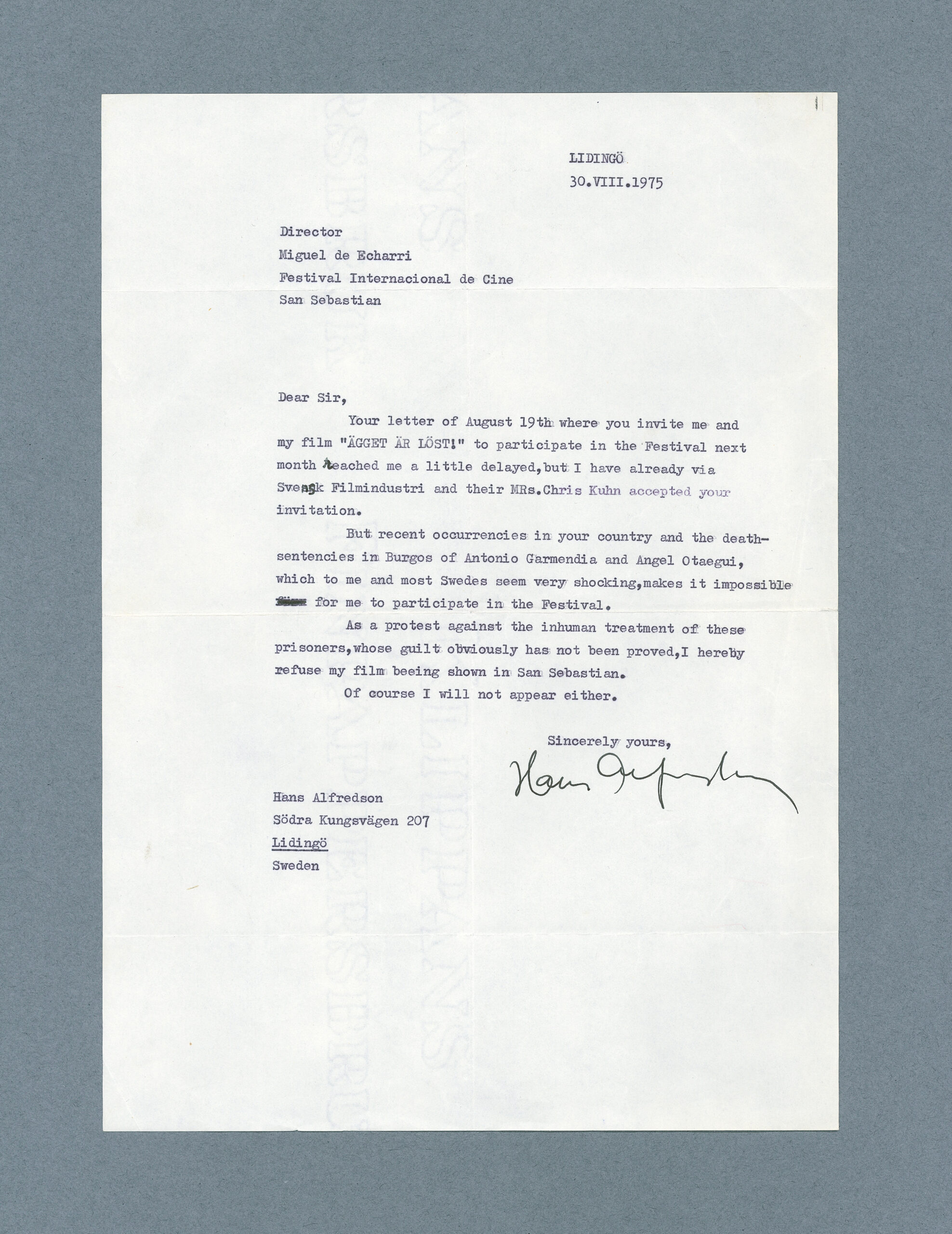 Alfredsonen gutunaren ondoren, hainbat pertsona ospetsuren, zinema-instituturen eta film-talderen dozenaka gutun eta telegrama iritsi ziren, eta Donostiara joateari uko egin zioten. 1975eko irailaren 27an erregimenak fusilamenduz burutu zituen Angel Otaegui, Juan Paredes Manot “Txiki”, Jose Luis Sanchez Bravo, Ramon Garcia Sanz eta Jose Humberto Baena Alonsoren heriotza zigor ez indultatuen exekuzioak.
